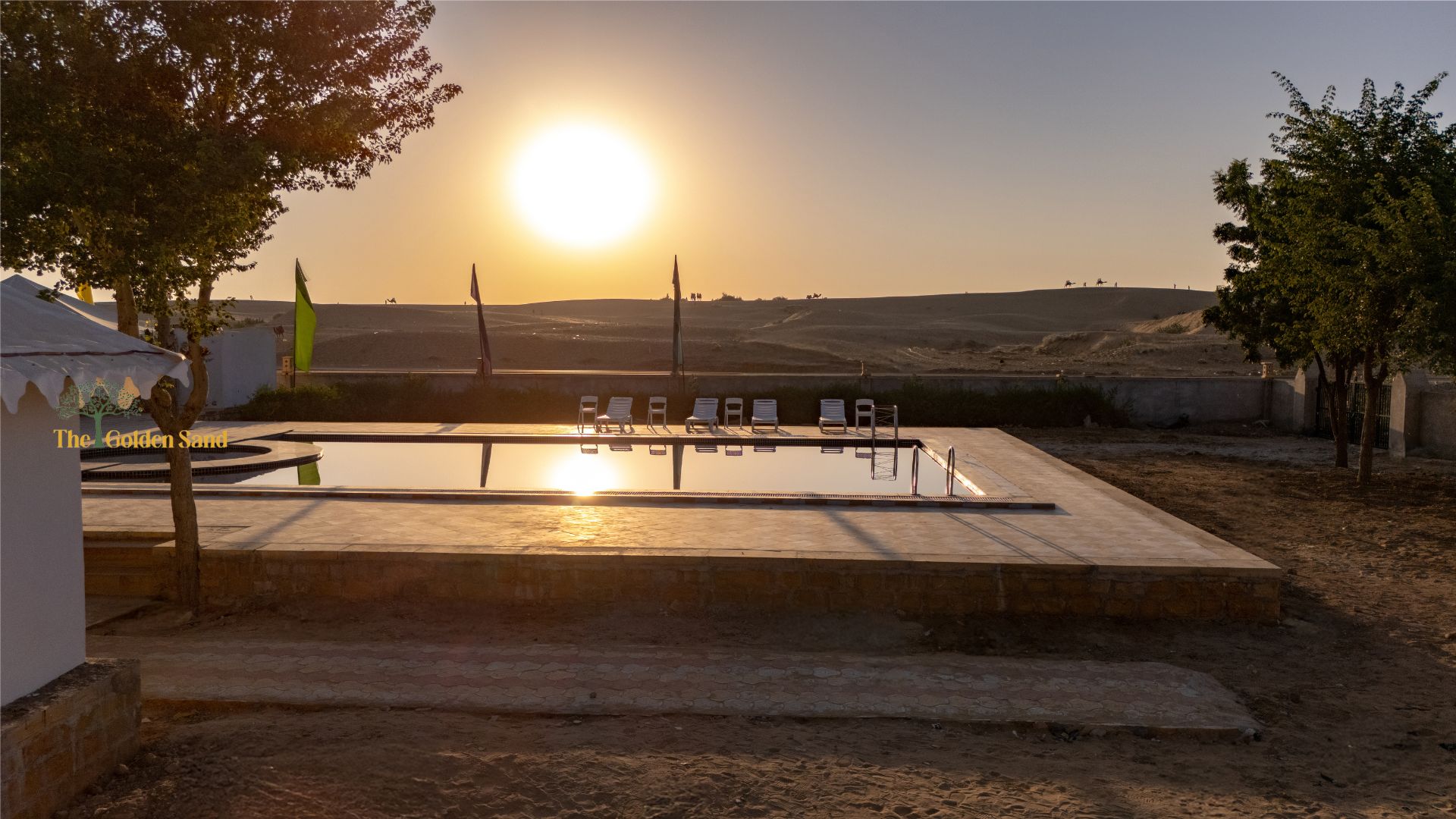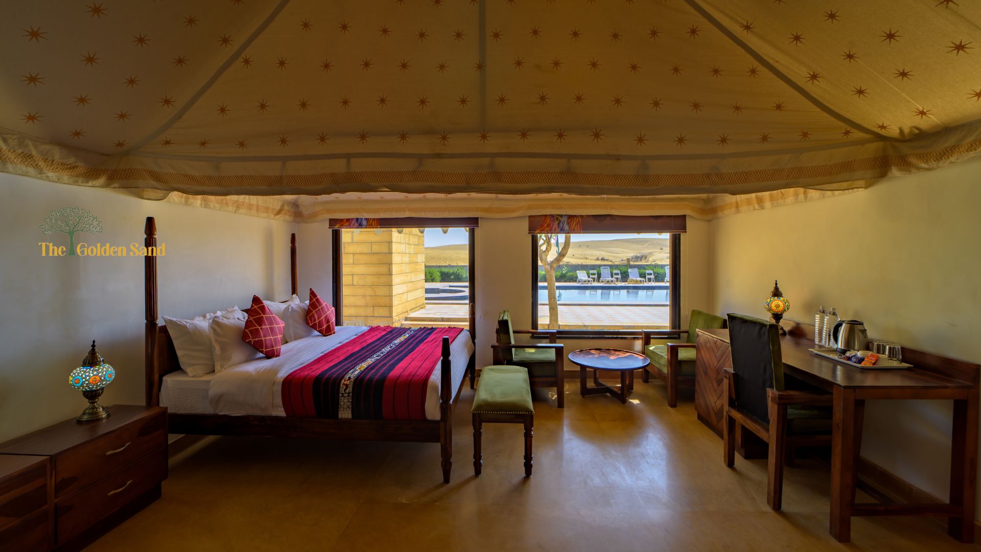 Live like royalty in our Maharaja Desert & Pool View Suite at The Golden Sand Resort, where opulence meets breathtaking natural beauty. This premium suite offers a panoramic view of the endless golden dunes and the refreshing poolside, blending desert charm with luxurious comfort.